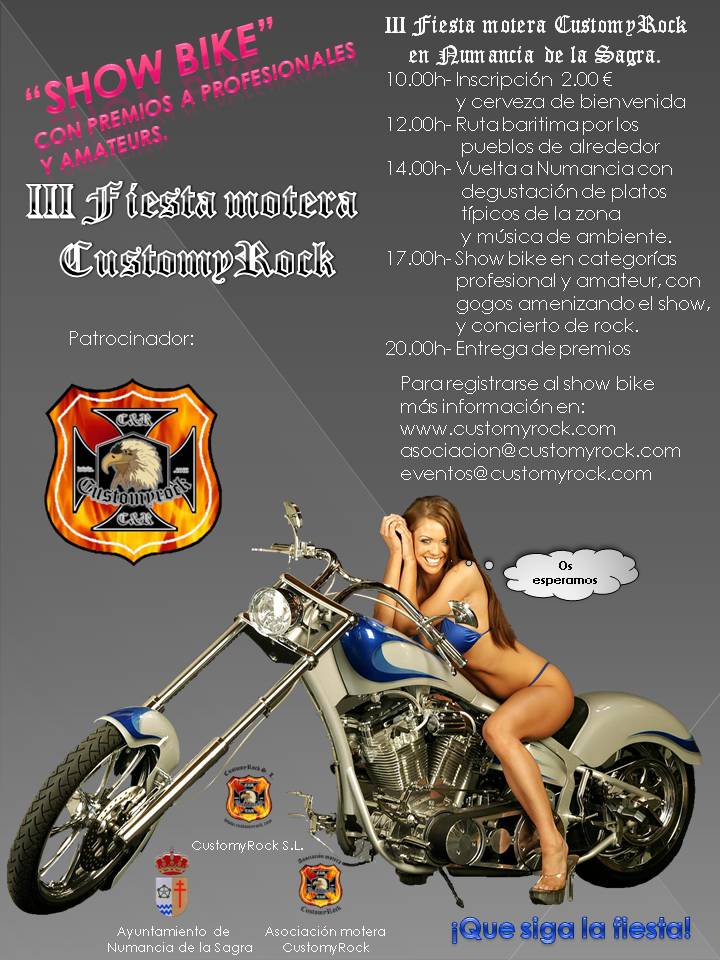 La movida empieza a las 10'00h con el registro de los asistentes al evento, esta vez a sido imposible poder gestionar todo para que os resultase gratis como en las otras ocasiones pasadas, pero la cuantiá del registro son "2'00 , prácticamente gratis si te das cuenta todo lo que os vamos a ofrecer en el evento. Y esos dos o tres euros nos sirven de mucha ayuda para sufragar esos gastos que no hemos podido llegar a ellos. Al registraros se os entregará una pulsera identificativa con la cual podréis, beber cervecitas de bienvenida por la patilla, degustación de tapas en los bares de Numancia, concertados por la asociación motera CustomyRock, platos típicos de la zona y más tradicionales, a elegir por el motero, más adelante pondremos los bares colaboradores y los platos que ofrecerá para deleite vuestro. Después de la comida viene el plato fuerte de esta fiesta, un show bike dentro de la discoteca Equs con premios increíbles en la categoría profesional, y un premio simbólico para la categoría amateur, en la que podrás participar tu mismo con tu moto. La entrada también es gratuita para los registrados.