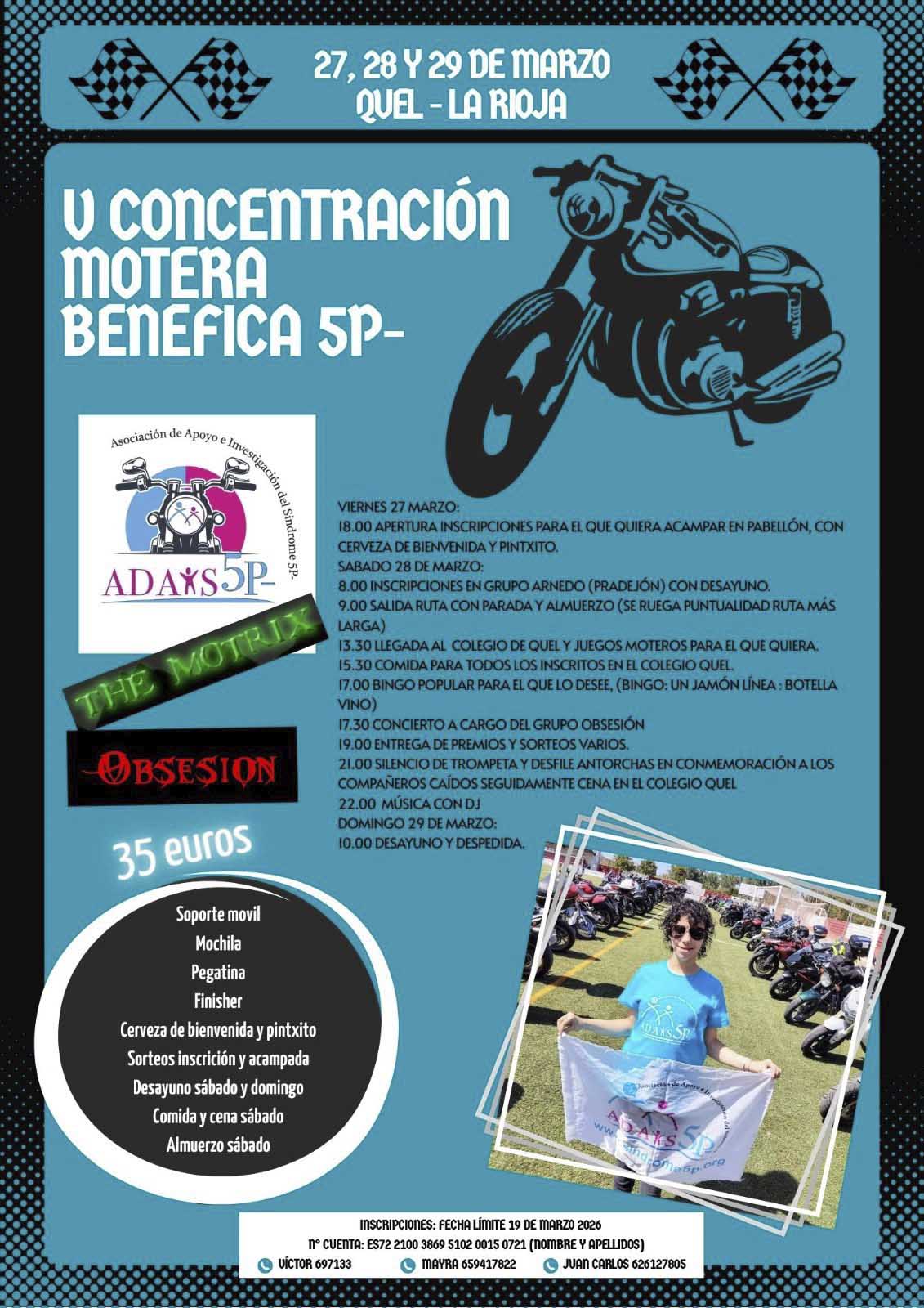 El fin de semana del 27, 28 y 29 de marzo se celebrará en Quel la quinta edición de la Concentración Motera Benéfica 5P- a beneficio de la Asociación de Apoyo e Investigación del Síndrome 5P-, cuya representante en La Rioja es Mayra Arellano, madre de Laia, una niña queleña afectada por esta enfermedad rara que acaba de cumplir 15 años.
