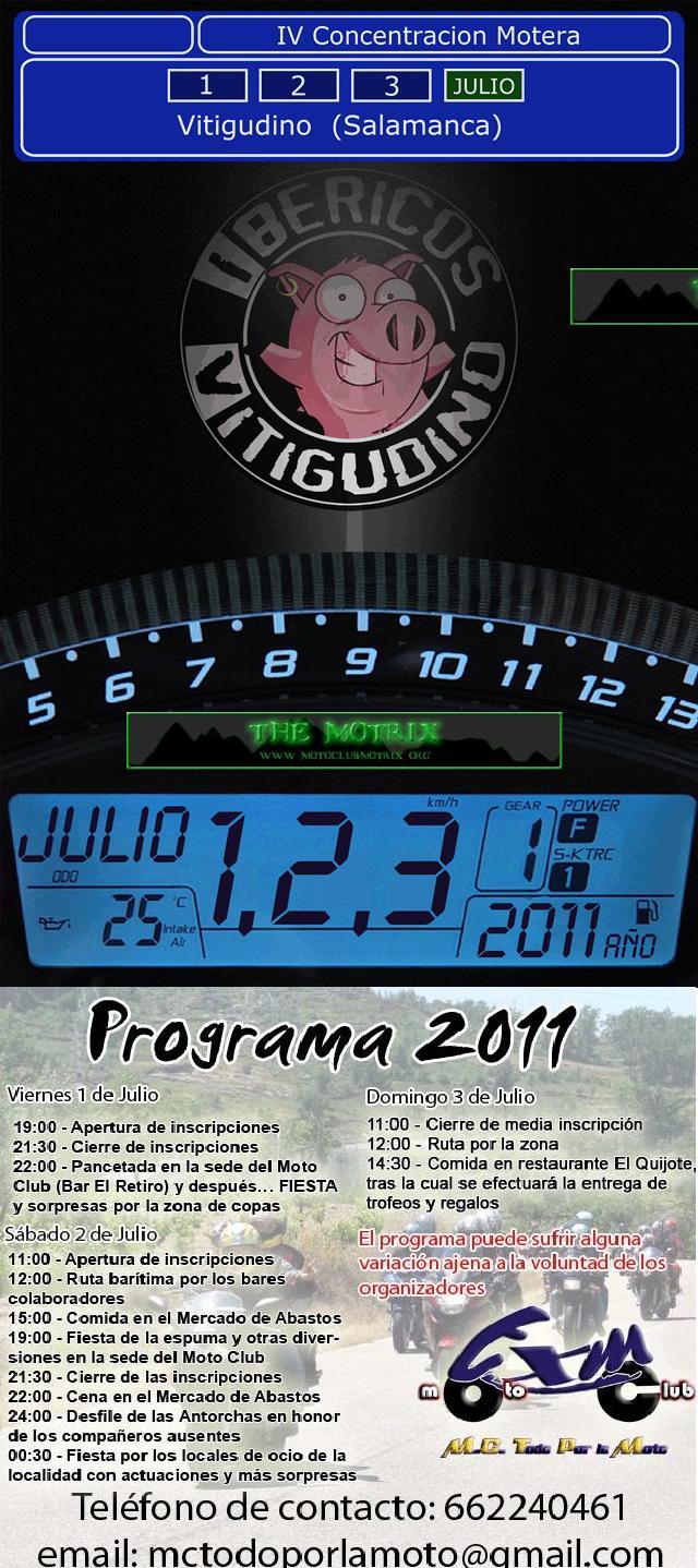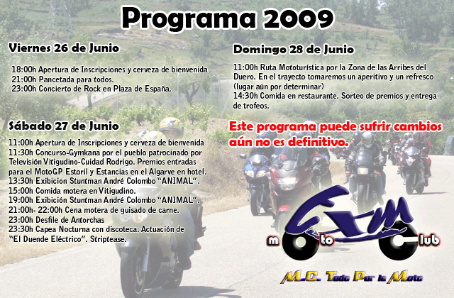 Explico un poco lo que va a ser. El viernes 6 de Junio habrá una capea nocturna con vaquillas y música para abrir boca, el sábado 7 tenemos una ruta moto-turística por las arribes del duero hasta la población de Villarino, donde actuará André Colombo "Animal" y comeremos en un lugar privilegiado en medio de la naturaleza obsequio del Ayuntamiento de la localidad. Volveremos a Vitigudino, donde volverá a actuar a las 19:00h André Colombo para los incondicionales, rezagados y vecinos de Vitigudino, justo despues (o entre medias, cada uno como quiera) ruta barítima por los locales colaboradores. Llegará la hora de la cena que daremos en el Mercado de Abastos, después el desfile de antorchas de rigor y fiesta motera en la plaza del pueblo con actuación del "Duende Electrico", discoteca móvil y gogos. El Domingo 8 de Junio realizaremos otra ruta moto-turistica, algo más larga, que nos llevará hasta tierras lusas, contemplando la desembocadura del águeda en el duero en el muelle de Vega-Terrón desde donde el Duero es Navegable hasta Oporto y desde donde se realizan multitud de viajes en barco haciendo esa ruta. Por Portugal llegaremos hasta el "salto" de Saucelle, presa fronteriza, disfrutando del parque natural "Arribes del Duero/Douro". Llegaremos a la población (ya en España) de Hinojosa de Duero donde seremos obsequiados con caña (o refresco) y pincho por el ayuntamiento. Y volveremos a Vitigudino para la comida. Tras ello, realizaremos la entrega de trofeos y un gran sorteo de lotes ibéricos para los inscritos. Todo ello por 25€ /15€ si es solo el domingo.