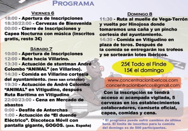 Por segundo año y tras examinar los aciertos y errores del primer evento organizamos la concentración Ibéricos en Vitigudino (Salamanca). Como el año pasado los puntos fuertes de esta concentración son la capea nocturna y los regalos de lotes ibéricos muestra de la industria chacinera que hay en la zona.