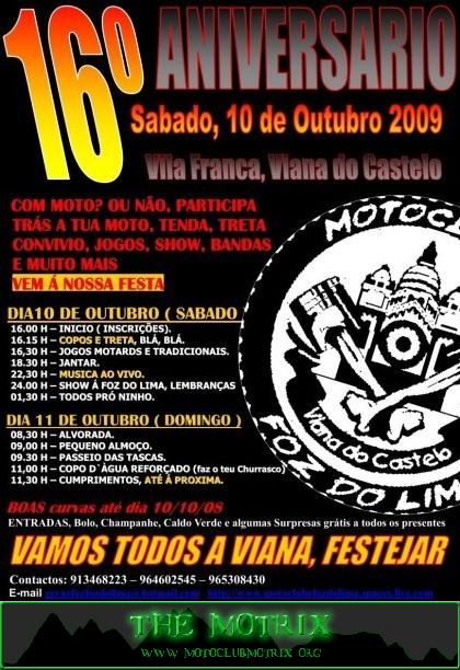 Agradecemos a todos os Sócios e Amigos do MotoClube Foz do Lima a vossa presença no 16º Aniversário a realizar nos dias 10 e 11 de Outubro no Centro Cívico de Vila Franca para festejar as 16 Primaveras, de vitórias lentas mas cheias de companheirismo e amizade que nos caracteriza, dignificando o espírito Motard e os convívios do M.C. Foz do Lima.
