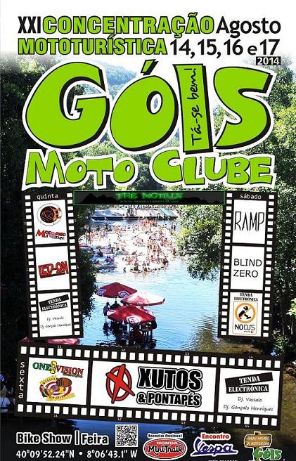 O Góis Moto Clube irá organizar a XXI Concentração Mototurística entre os dias 14 e 17 de Agosto de 2014. Como já é habitual os visitantes podem disfrutar de toda as potencialidades desta Região em ambiente de convívio e de festa.