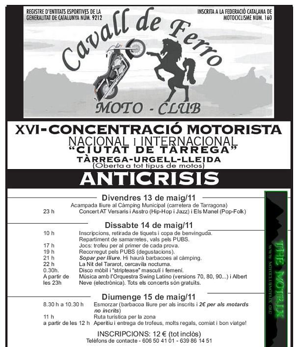 Nos dirigimos a todos los moteros y amigos que a lo largo de estos dieciséis años de CONCENTRACIONES MOTORISTAS “CIUTAT DE TÀRREGA“ nos habéis acompañado y colaborado en su éxito, para comunicar que este año 2012 no se llevará a cabo por motivos de presupuesto municipal y la falta de rotación en los ORGANIZADORES.