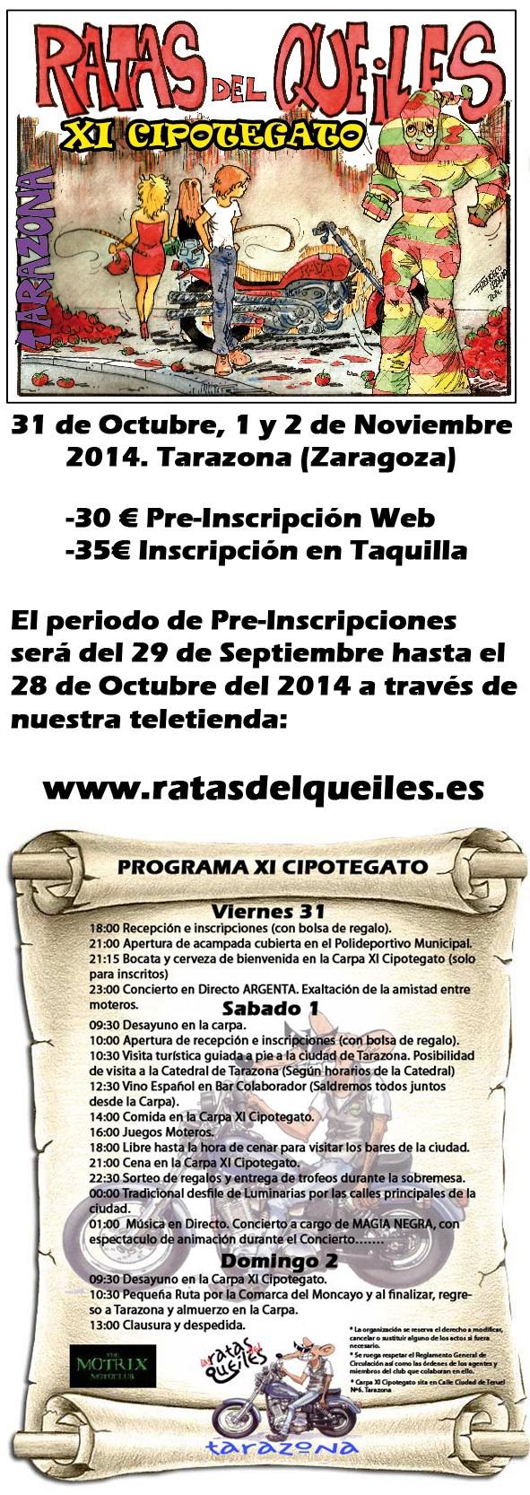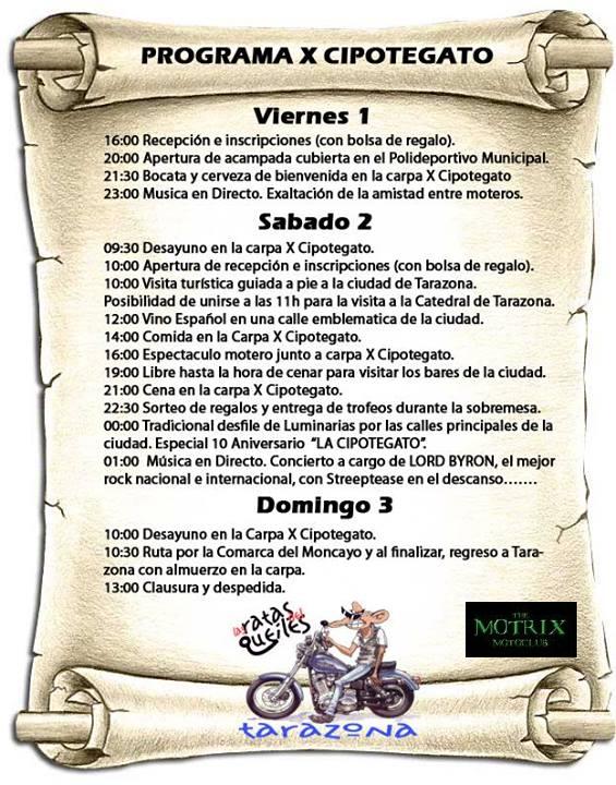 Amigos Moteros!!! Un año más la Asociación Motera las Ratas del Queiles organiza la Concentración Motera "LA CIPOTEGATO" en Tarazona (Zaragoza) a la cual os animamos a participar.