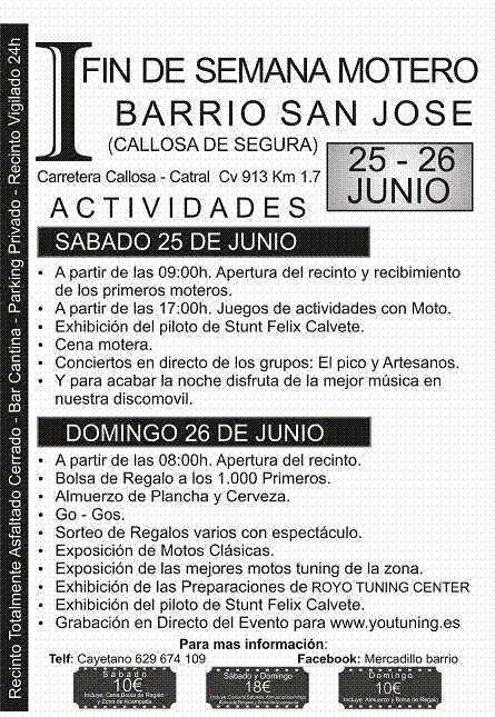 Y el día 26 habrá almuerzo, go-gos, miss camiseta mojada, sorteos, regalos y más exhibiciones, además de un paseo motero por la ciudad de Callosa de Segura. Habrá zona de camping vigilada y gran zona de aparcamiento.