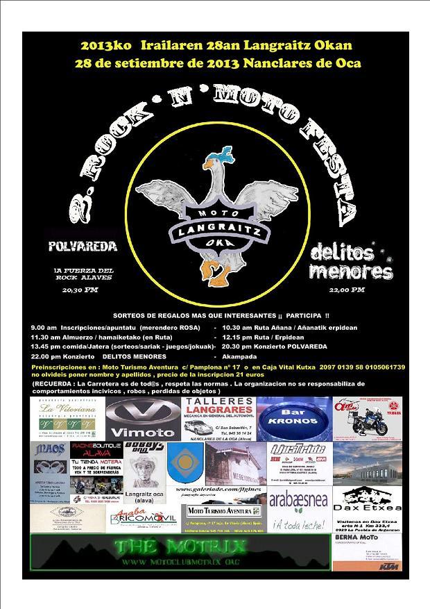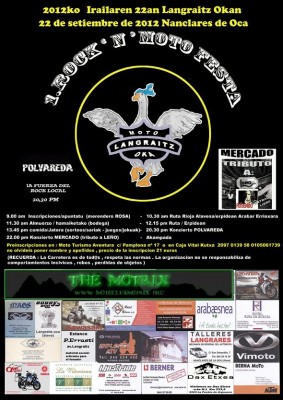 primera rock´n´moto festa en nanclares de la oca-alava......salida del merendero Rosa tempranito...vuelta en moto el 22 de setiembre de 2012....con almuerzo en rioja alavesa y comida cerca de vitoria para terminar con dos conciertos en nanclares, en el merendero Rosa y que cada cual duerma en su tienda que la puede montar justo al lado...en la kampa.