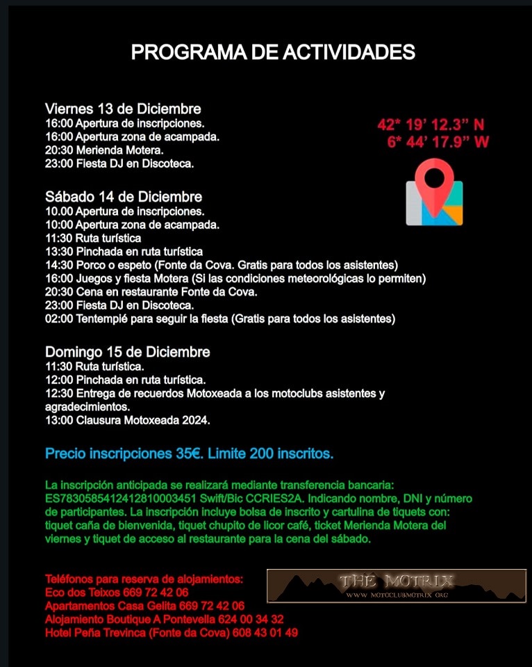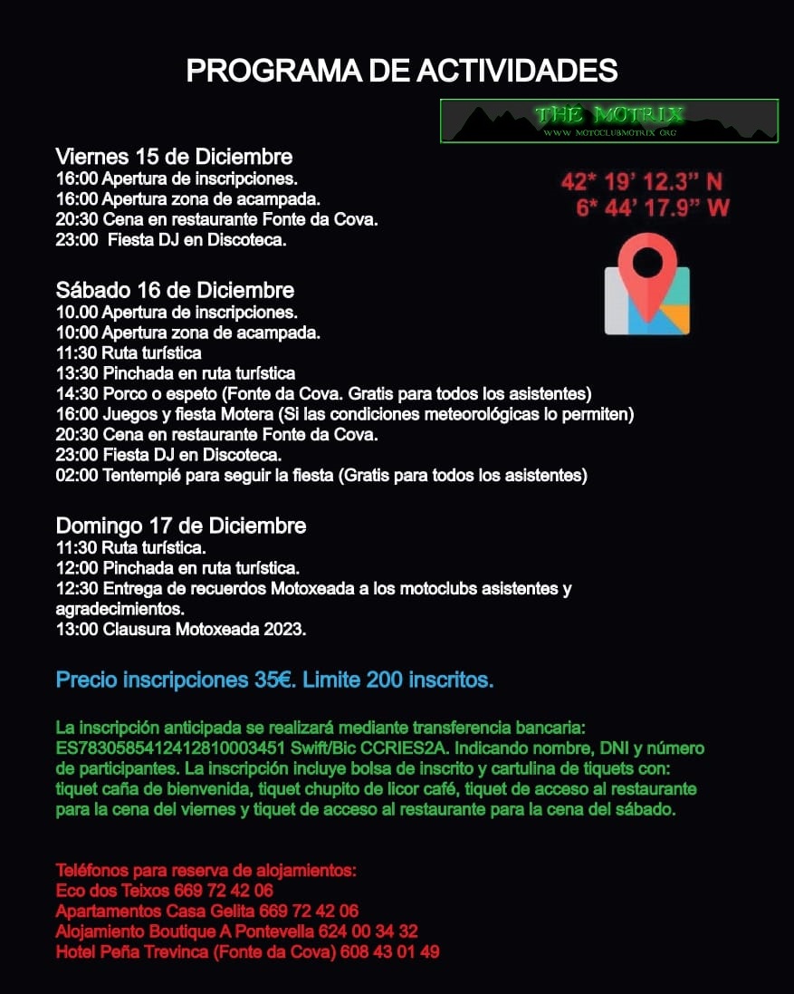 Para realizar tu pre inscripción y tener derecho a poder inscribirte en la concentración y así poder disfrutar de todas las actividades se debe realizar un ingreso en el numero de cuenta ES30 0075 8921 1106 0020 7162 por la cantidad de 5€ donde debes indicar tu nombre, apellidos y DNI y poner en concepto pre inscripción Motoxeada y esos 5 euros te serán descontados al recoger tu bolsa a la llegada al recinto.