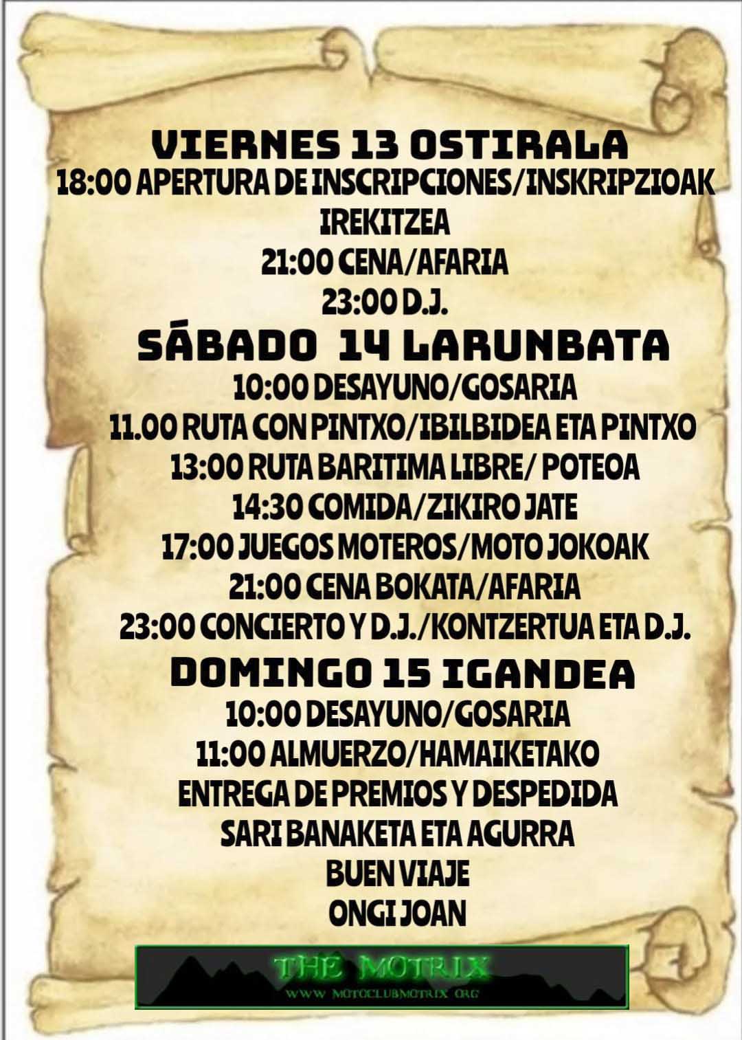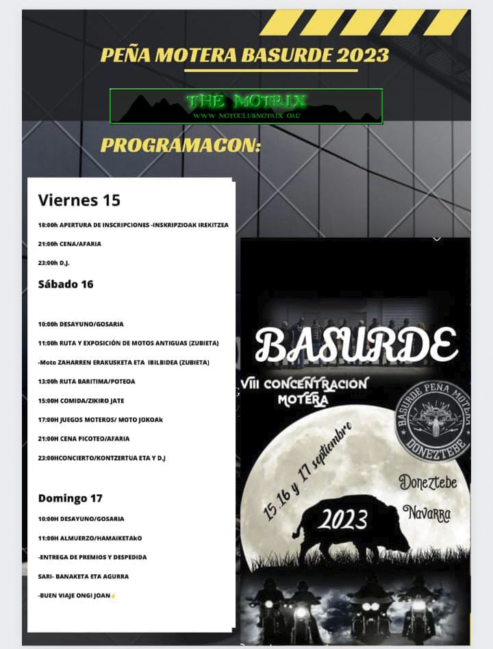 Aunque este fin de semana daba mucha lluvia, nosotros decidimos salir igual, cada salida es una aventura. Nos pusimos en marcha a eso de las 06:00 h de la mañana del viernes, Bulma , Francis y yo para poder pasar por Logroño. Donde allí nos juntaríamos con Zara AQUELARRE AM y Rubén. Durante el camino pillamos lluvia a la altura de Calatayud, donde nos pusimos los trajes de agua hasta llegar a Logroño. En Logroño realizaríamos una paradita para comer y coger fuerzas. Una vez llegaron el resto del grupo. Nos pusimos en marcha para Basurde, con nuestros trajes de agua. Al llegar a Basurde, nuestra sorpresa fue que no se realizaba donde el año pasado, al lado del cementerio. Había habilitado una carpa para comer en el centro del pueblo. Muy bien pensado, pues había previsión de lluvias. Otra sorpresa fue que dormíamos en otro pabellón deportivo, no el del año pasado, que fue un desastre. Este estaba muy bien. De hecho, fuimos los primeros en llegar y no los abrieron los de la organización. Este año a estado muy bien el tema de las comidas, cenas y desayunos. La ruta turística estuvo muy bien, pues coincidió en un pueblo con motos clásicas y por supuesto con bebida y pica pica. Aunque podrían haberse puesto un poco mejor las mesas donde estaba el pica pica. Pues era difícil el acceso, la gente se quedaba allí mismo. Él grupo de música que toco el sábado noche muy bien, pero las dos chicas que realizaron de DJ……que por cierto no era la más idónea para estos ambientes. El domingo nos levantamos, recogimos las tiendas, fuimos almorzar y a la entrega de premios. Una vez terminados la entrega de premios nos pusimos rumbo para casa. Francis , Bulma y yo , para Barcelona y Zara y Rubén para Logroño. Realizamos ruta junto de vuelta asta Pamplona con lluvia.
