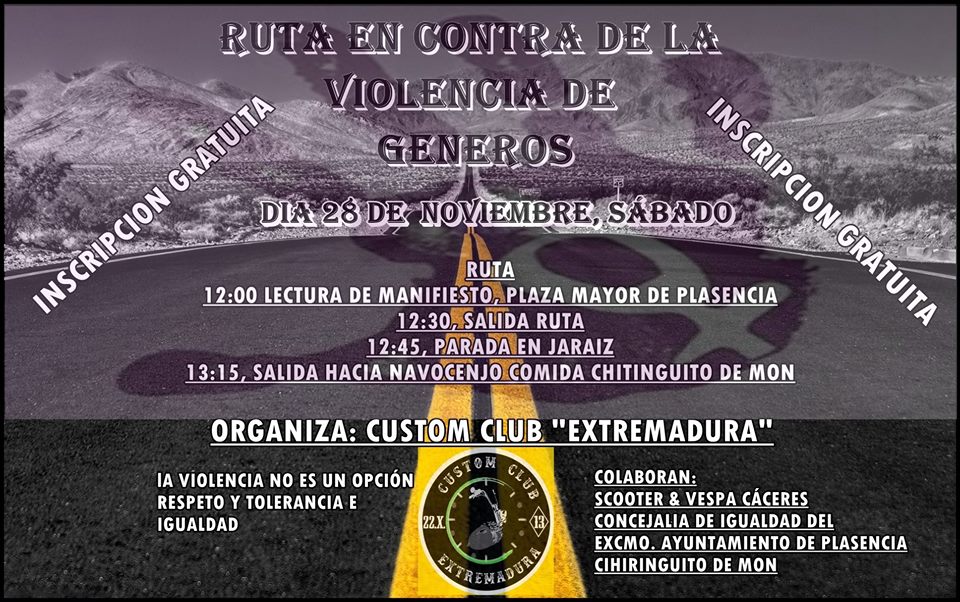 Me he permitido ponerme en contacto con ustedes para darles a conocer una concentración motera que se celebrará el próximo día 28 en Plasencia organizada por el club motero Custom Club Extremadura y que tendrá como fin concienciar a la sociedad que todos tenemos que luchar contra la Violencia de Género y en la que intentarán recaudar fondos para ayudar a nuestra asociación.