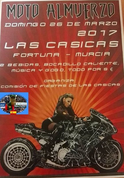 EL PROXIMO DOMINGO 26 DE MARZO LA COMISION DE FIESTAS DE LAS CASICAS DE FORTUNA ( MURCIA ) POR TAN SOLO 5 EUROS NOS OFRECEN 2 BEBIDAS + UN RECUERDO A CADA MOTERO + UN BUEN BOCATA CALIENTE + MUSICA + GOGO + SORTEOS + HABRA PAELLA CASERA PARA LOS 100 PRIMEROS CON UNA BEBIDA POR TAN SOLO 3 EUROS + POR CADA CAFE UN TROZO DE BIZCOCHO CASERO Y MUCHA FIESTA