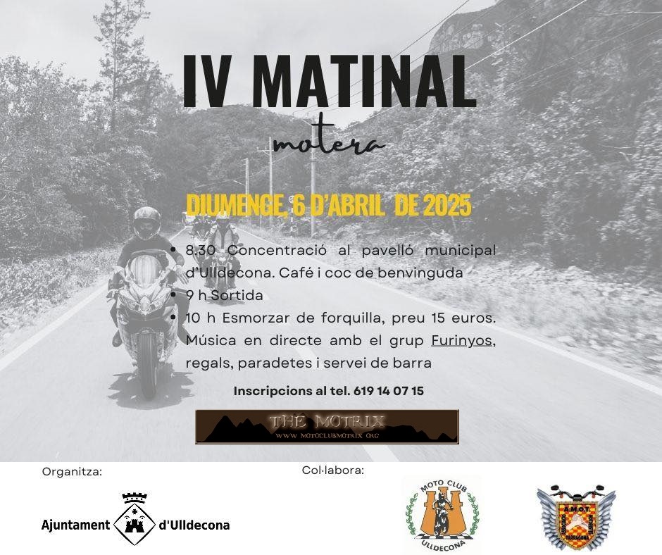 Esmorzar de forquilla , parades de productes moteros ,música en viu amb el grup de rok Furinyos i sorteigs de regals . Obert a tot tipus de motos. Vine a esmorzar en lo Motoclub Ulldecona i gaudir de la matinal encara que no tinguis moto