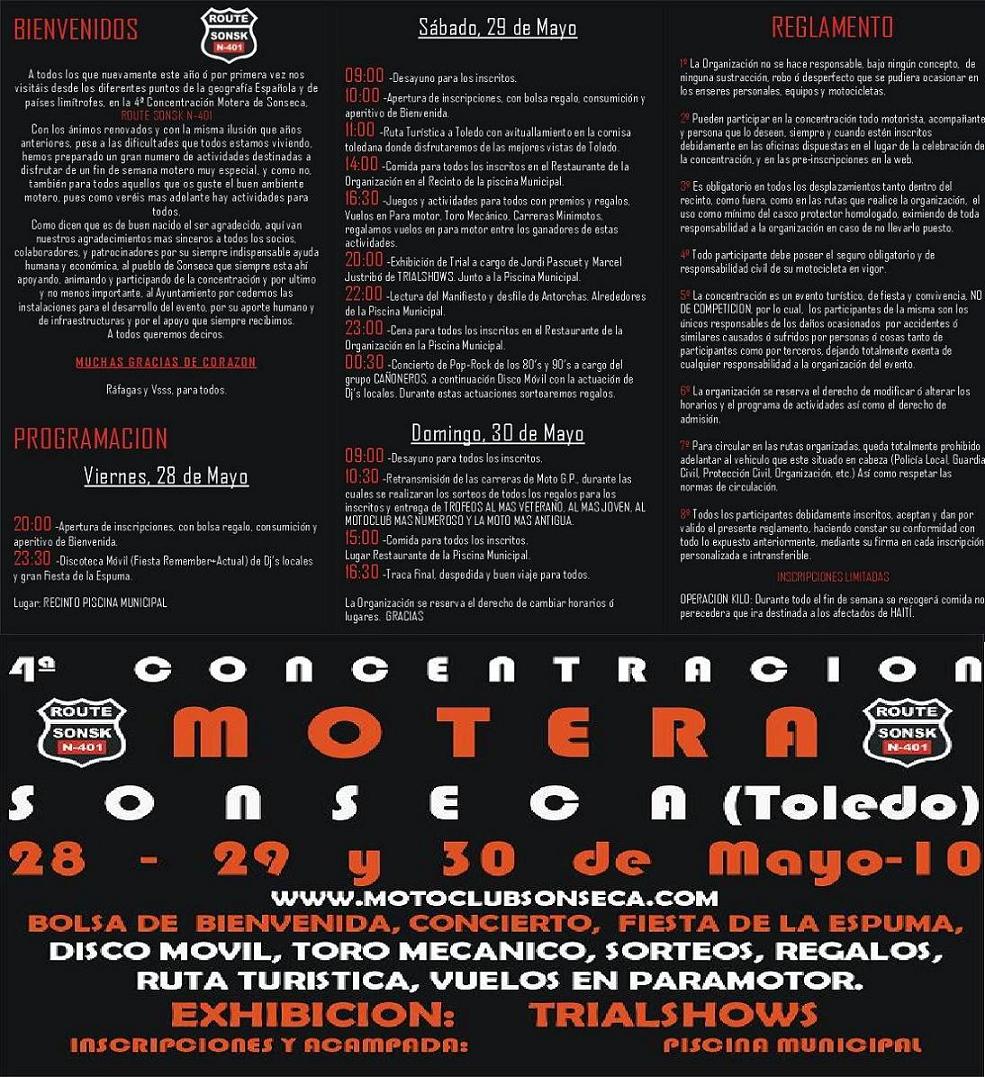 COMIDA Y CENA DEL SABADO, RUTA BARITIMA, EXHIBICION DE STUNG A CARGO DE NARCIS ROCA, COMIDA DEL DOMINGO Y PROYECCION DE LAS CARRERAS EN MUGELLO. CONCIERTOS Y SORTEOS.
