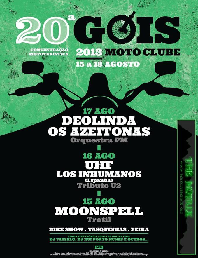 O Góis Moto Clube tem o prazer de vos convidar a comemorarem connosco o vigésimo aniversário da nossa Concentração Mototurística de Góis que decorrerá entre os dias 15 e 18 de agosto de 2013. Este ano, e no seguimento do ano transato, mantemos o valor do bilhete geral, e único de €20,00 com direito a: